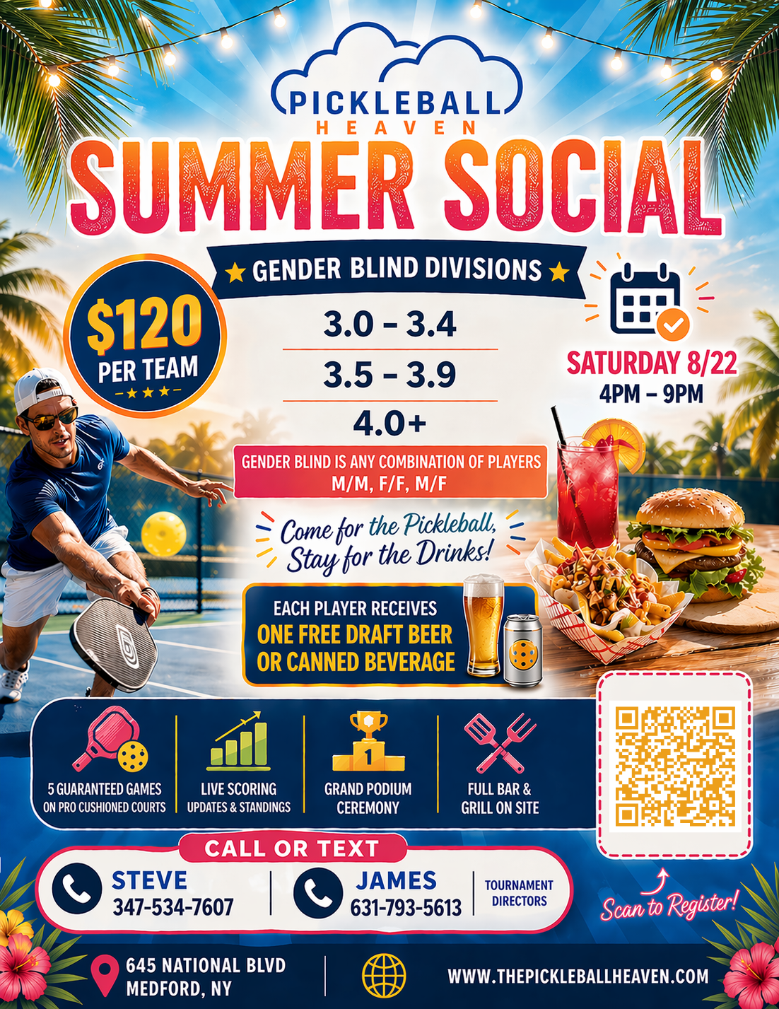 Come for the Pickleball, Stay for the Drinks! This social event features gender blind divisions (M/M, F/F, M/F combinations) across different skill levels. Each player receives one free draft beer or canned beverage. The event includes 5 guaranteed games on pro cushioned courts, live scoring updates & standings, a grand podium ceremony, and a full bar & grill on site. Cost is $120 per team.
