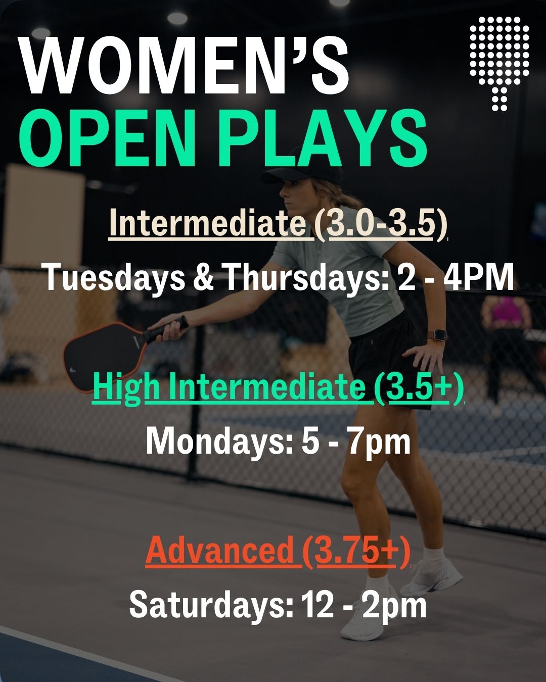 Women's open play for intermediate skill levels (3.0-3.5).